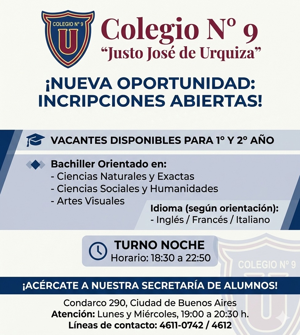 Estimada gente: si ustedes saben de chicos y chicas de 15 años en adelante que quieran comenzar o continuar sus estudios en el turno vespertino  (de 1830 a 2250) agradecemos compartir esta publicación. El tradicional Colegio Urquiza de Flores brinda 90 años de experiencia,  el mejor ambiente para acreditar materias y miles de posibilidades para tu trayectoria escolar. Y como siempre,  profesores con dedicación y paciencia. ¡Excelente comienzo para tod@s !
